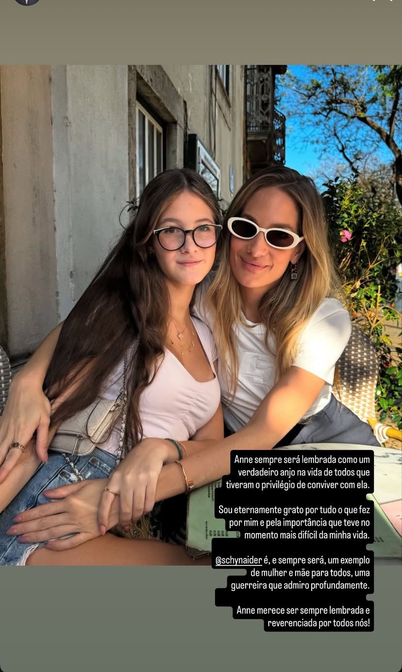 “Schynaider é, e sempre será, um exemplo de mulher e mãe para todos, uma guerreira que admiro profundamente. Anne merece ser sempre lembrada e reverenciada por todos nós!”, completou.