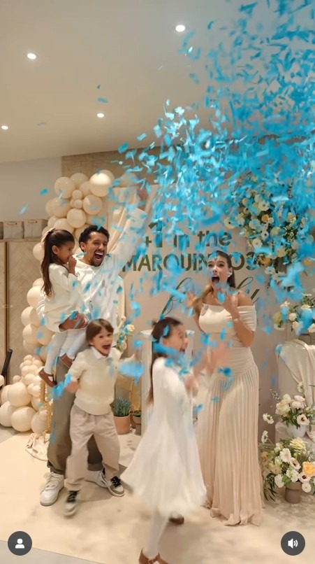 Após confirmar a gravidez, a família organizou um chá revelação para descobrir o sexo do bebê. O evento contou com decoração em tons neutros, flores e balões, além da frase “+1 in the Marquinhos family” estampada em verde no espaço escolhido para a celebração.