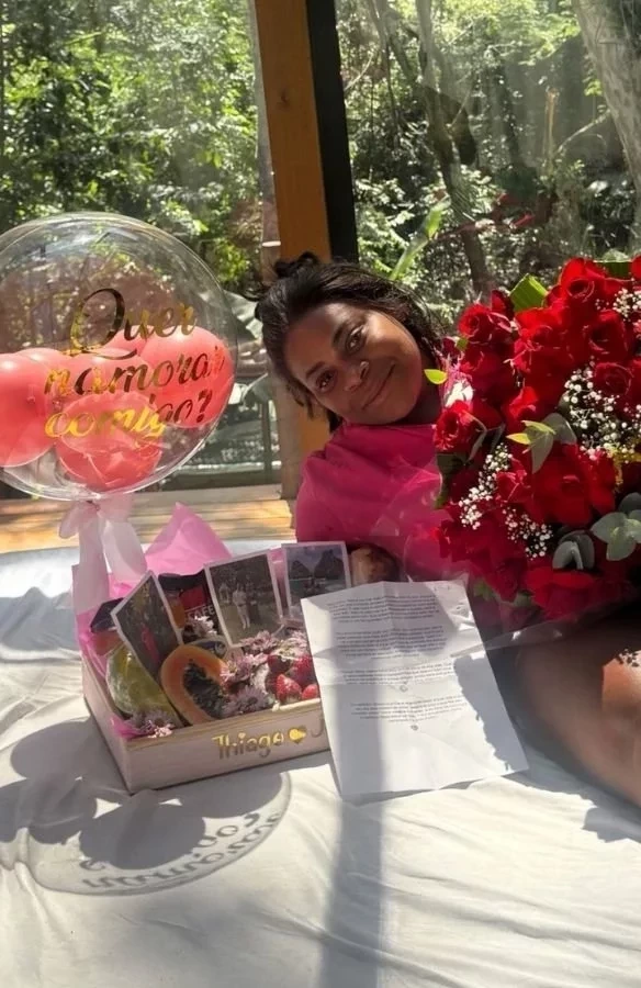 Jojo iniciou o mistério ao publicar uma foto agarrada ao seu buquê de rosas. Logo depois, ela revelou que as flores não foram o único mimo; ela também ganhou um café da manhã especial e uma cesta personalizada com os nomes dela e de Thiago.