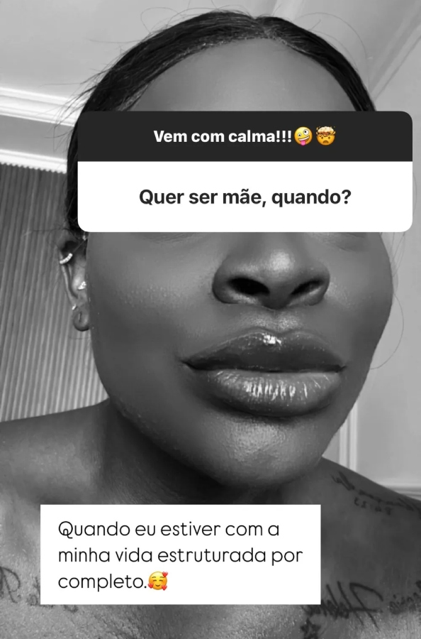 Outra pessoa também questionou quando a funkeira será mãe, já que, anteriormente, ela havia falado sobre a adoção de um menino angolano, mas, pouco tempo depois, explicou que era apenas madrinha dele. "Quer ser mãe quando?" A dona do hit Que Tiro Foi Esse respondeu: "Quando eu estiver com a vida estruturada por completo."