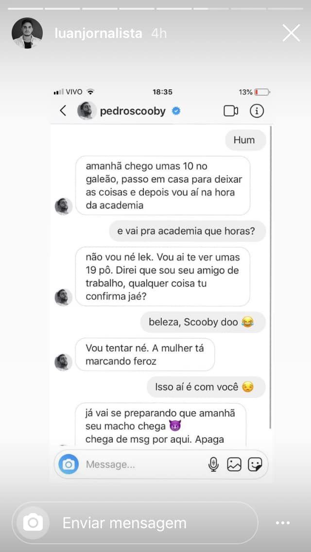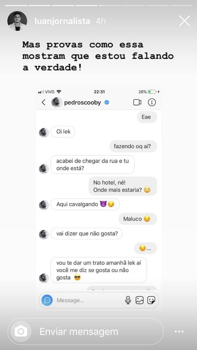 O jornalista Luan Santos de 24 anos ficou conhecido nos últimos dias pelo suposto envolvimento com o surfista Pedro Scooby em 2017. Em entrevista ao IG Gente , ele disse que ter divulgado o caso lhe fez ter voz para “poder desmascarar uma pessoa” e não para conseguir mídia.