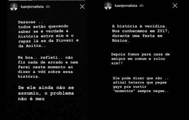“Eu publiquei tudo isso para mostrar que tem muitos casos de homens que são heterosexuais , que têm família e se envolvem com outros homens. Sendo que logo depois eles não querem saber como é que tá a outra pessoa, com quem ele se envolveu, né?! Existe muito isso no mundo gay , de um homem hétero vir ficar com o gay, mas não tá nem aí e não quer se envolver", disse. Mesmo sabendo do teor do fato, o Luan disse que não estava preparado para tamanha repercussão em cima do caso .
