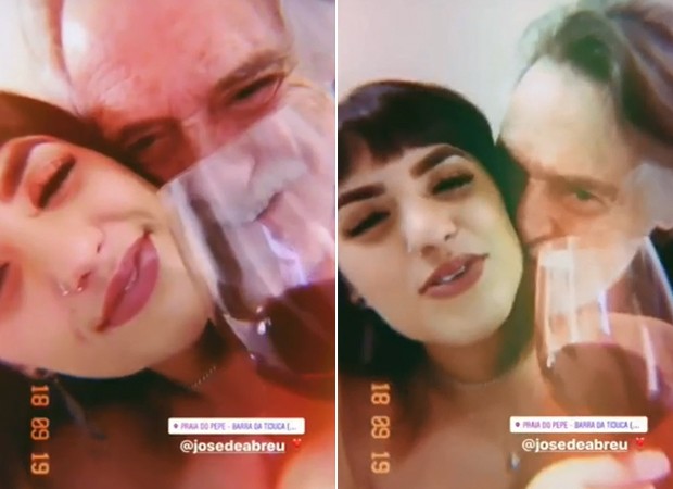 A noite foi de romance para José de Abreu e Carolynne Junger. A jovem, que é namorada do ator, publicou em seu Instagram um vídeo em que os dois aparecem coladinhos, cantando e tomando vinho juntos.