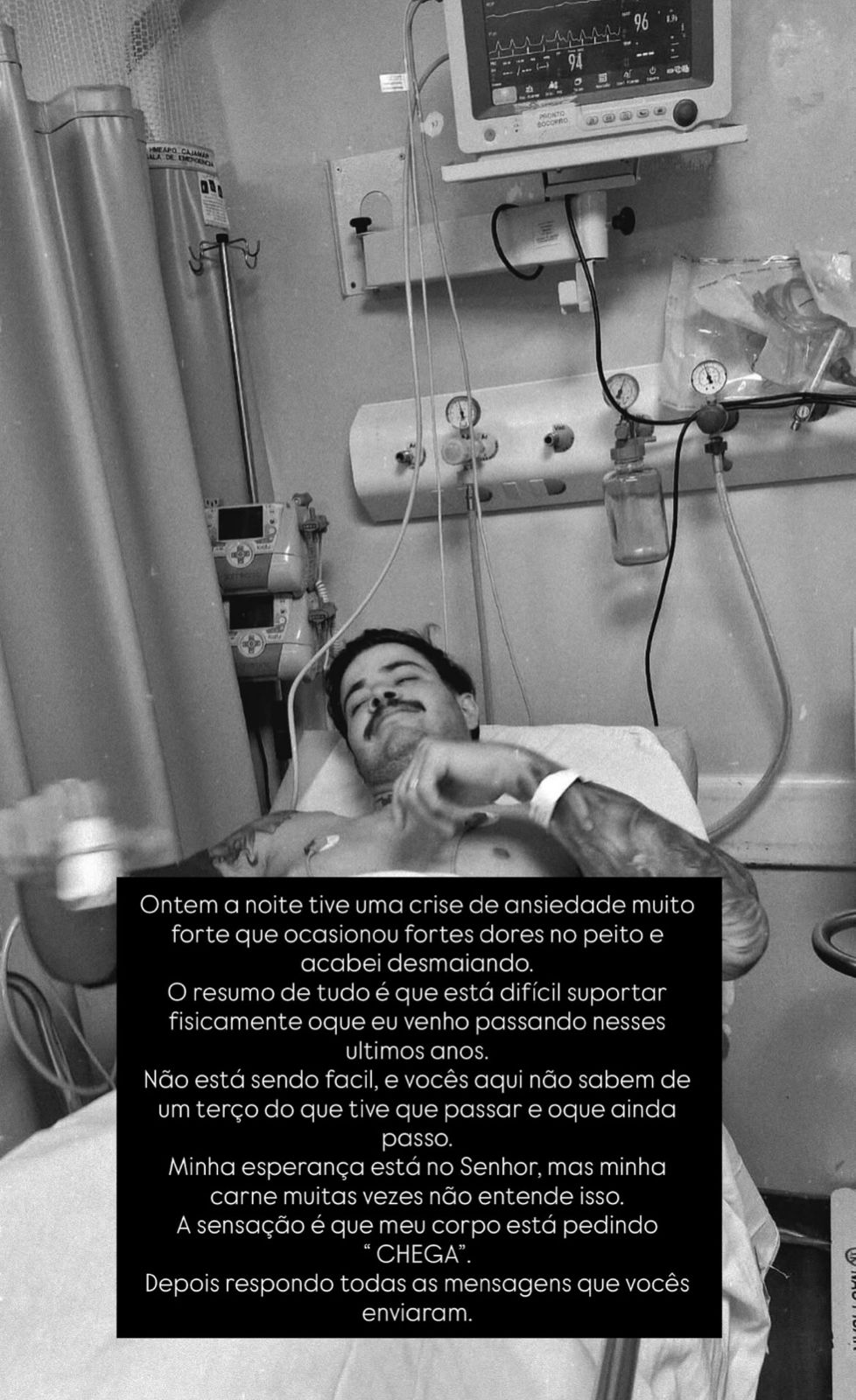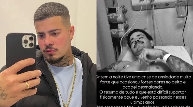 Em uma imagem publicada, o artista aparece deitado em uma cama de hospital. No relato, ele explicou que o abalo emocional vem após um período difícil em sua vida pessoal e profissional.
