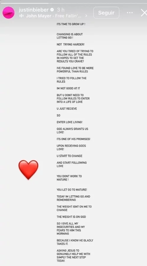 "É hora de crescer! Mudar é sobre deixar ir, não se esforçar mais! Você está cansado de tentar seguir todas as regras na esperança de obter os resultados que deseja? Descobri que o amor é mais poderoso do que regras", iniciou ele em seus stories.