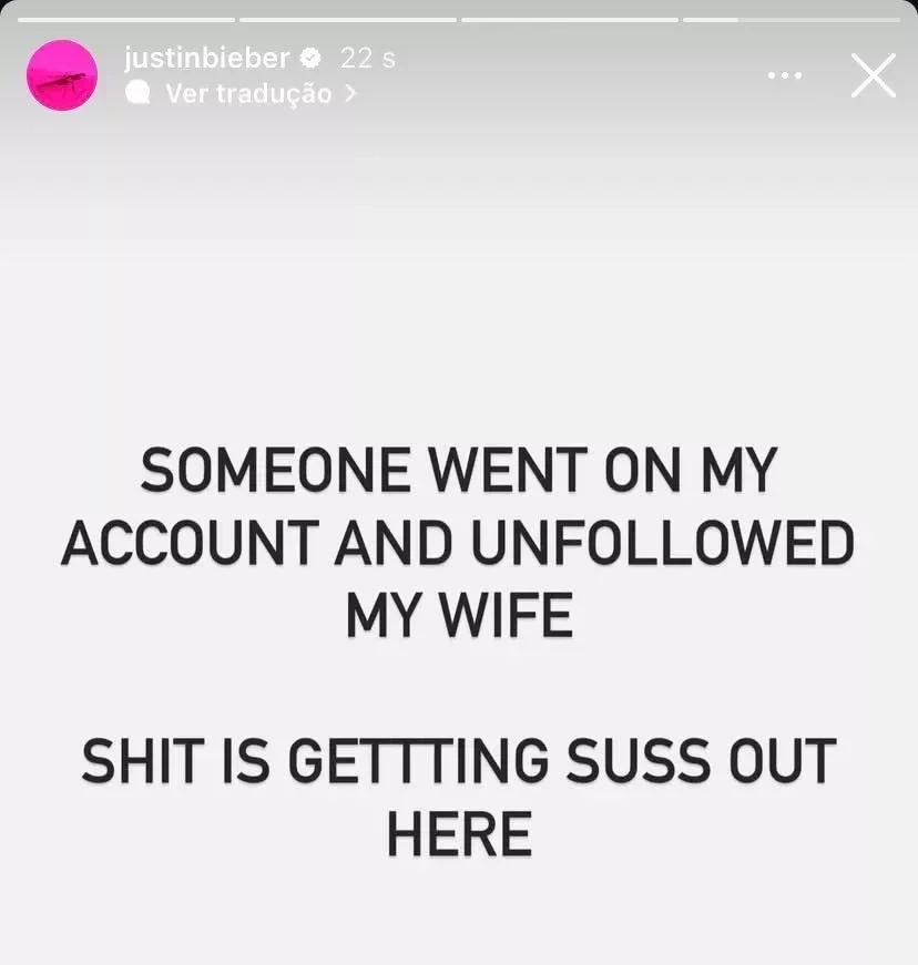 Segundo o astro canadense, um hacker teria invadido sua conta e realizado o ato. "Alguém entrou na minha conta e parou de seguir a minha mulher. Essas m*rdas estão ficando estranhas aqui", escreveu. Em seguida, Bieber apagou a publicação.