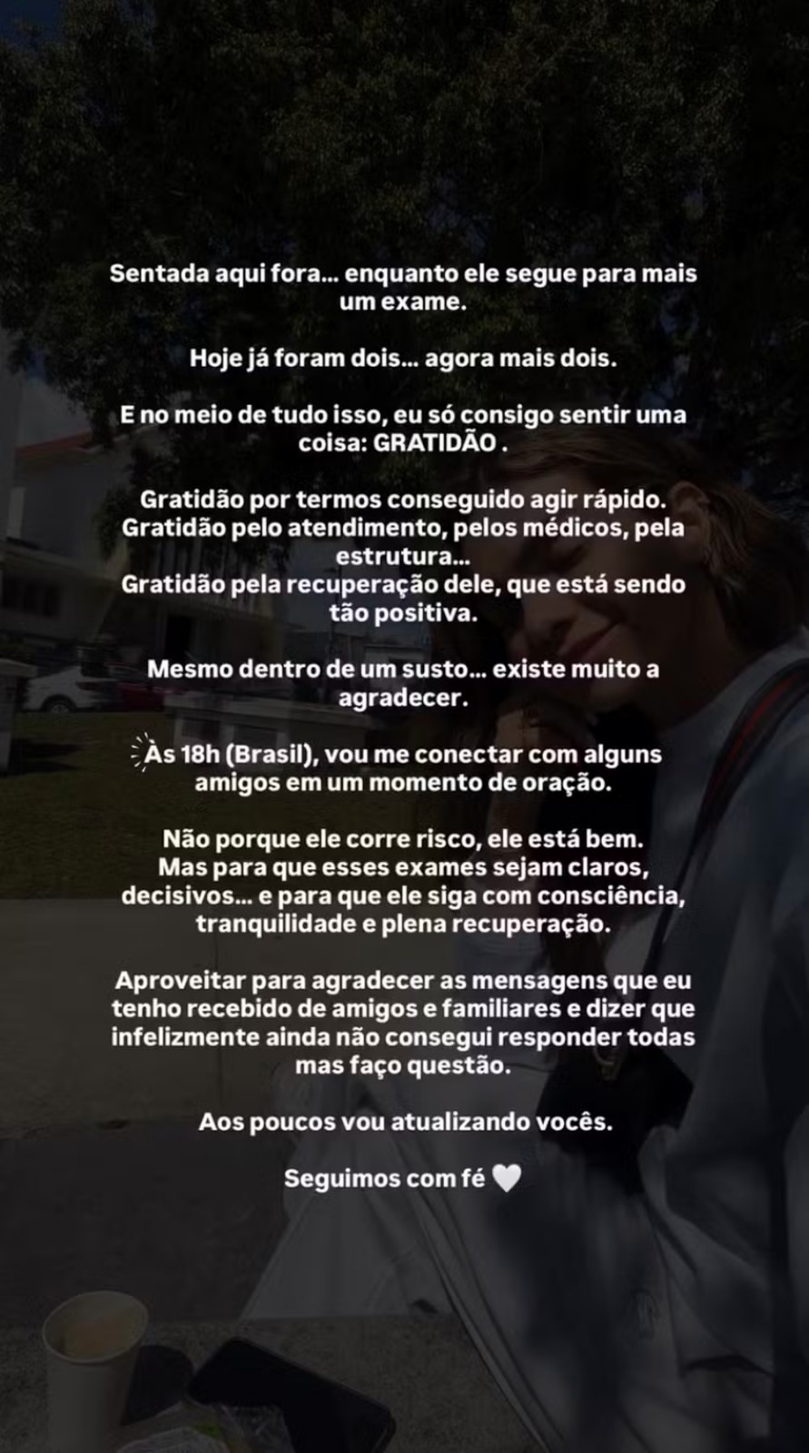 "Sentada aqui fora enquanto ele segue para mais um exame. Hoje já foram dois... agora mais dois. E no meio de tudo isso, eu só consigo sentir uma coisa: gratidão. Gratidão por termos conseguido agir rápido. Gratidão pelo atendimento, pelos médicos, pela estrutura. Gratidão pela recuperação dele, que está sendo tão positiva."