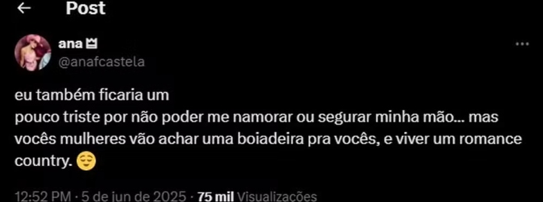 Após a brincadeira, Ana Castela fez uma publicação em seu perfil no X para comentar sobre seu próprio charme e garantiu que espera que cada seguidor(a) encontre uma boiadeira para viver um romance.