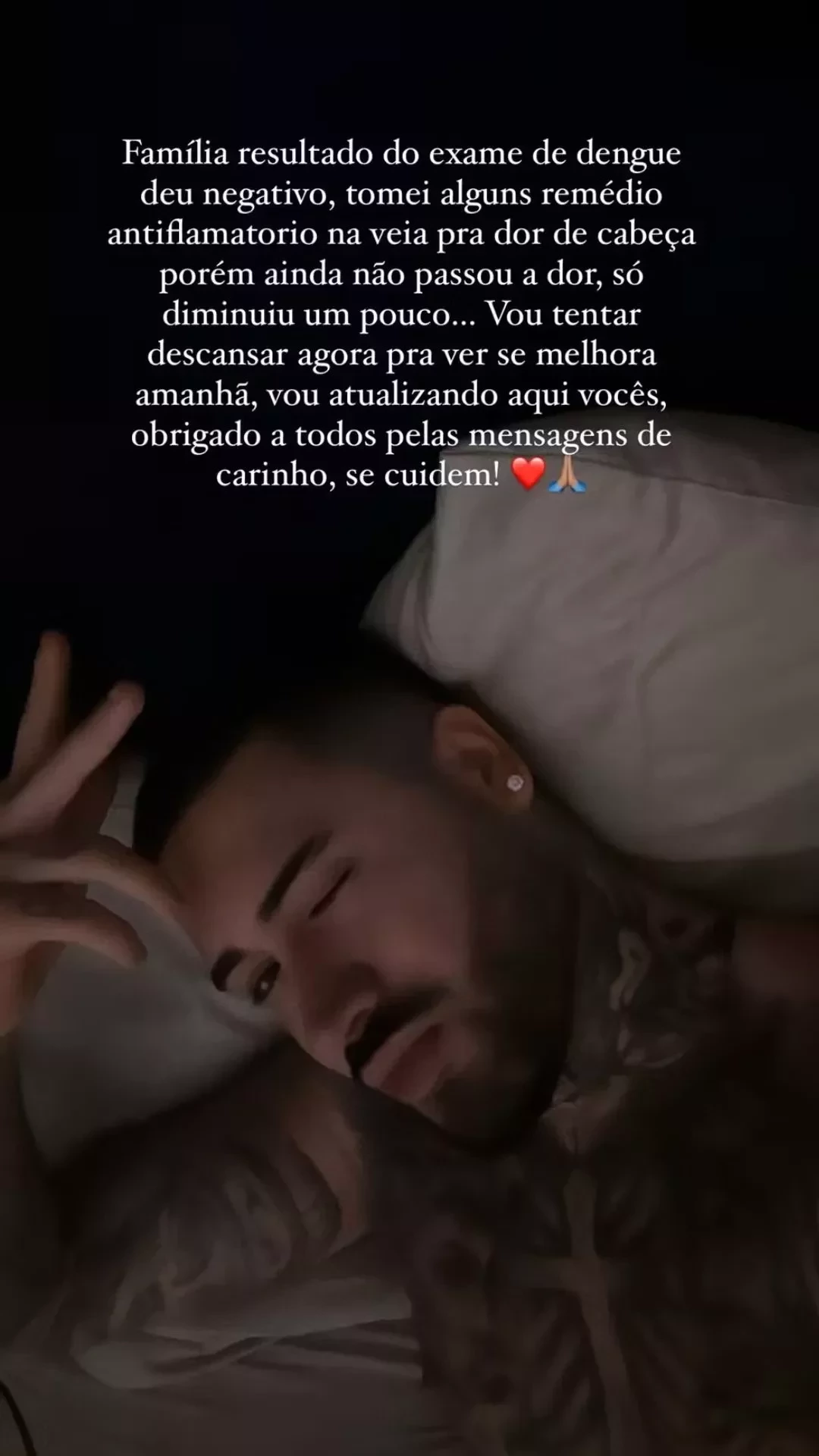 Já na madrugada, ao retornar para casa, o músico informou seus seguidores sobre sua condição. "Família, o resultado do exame de dengue deu negativo, tomei alguns remédios anti-inflamatório na veia para dor de cabeça, porém ainda não passou a dor, diminuiu um pouco... vou tentar descansar agora pra ver se melhora. Vou atualizando vocês, obrigado a todos pelas mensagens de carinho, se cuidem."