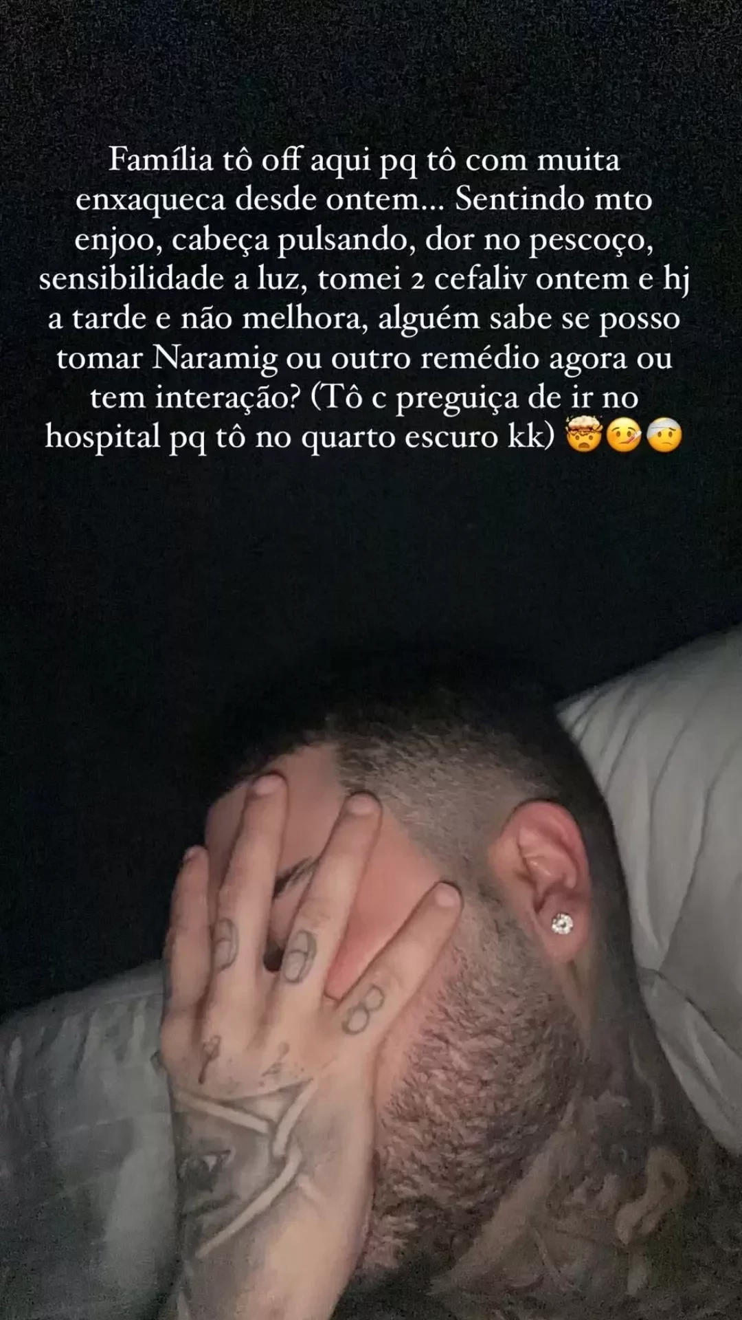 "Família, estou off aqui porque estou muita enxaqueca desde ontem... sentindo enjoo, cabeça pulsando, dor no pescoço, sensibilidade a luz", iniciou o artista, acrescentando que os medicamentos utilizados não estavam surtindo efeito. "Estou com preguiça de ir ao hospital porque estou no quarto escuro."