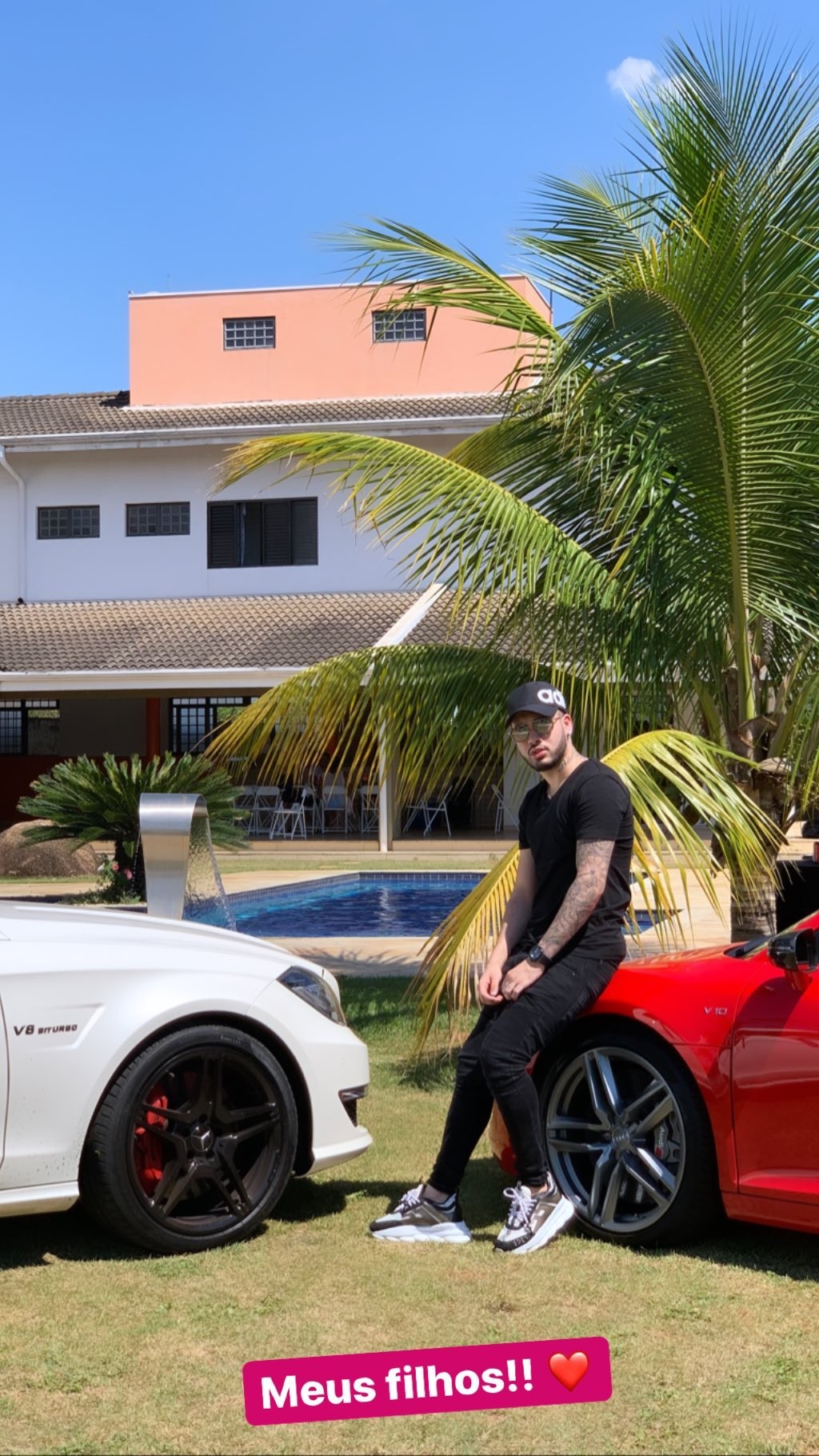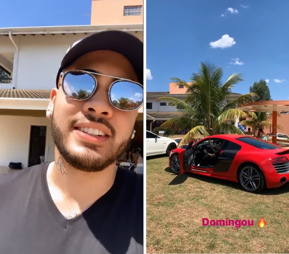 Em uma das imagens, ele mostra os dois carros e escreve "Meus filhos" na legenda. Os carros são um Audi vermelho, que é acelerado pelo cantor no vídeo, e uma Mercedes modelo V8 Biturbo avaliada em mais de 600 mil reais.
