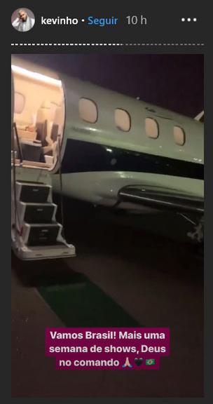 Em outra imagem, já dentro do avião, ele relaxou com as pernas esticadas no assento: "O moleque dos hits, baby!".