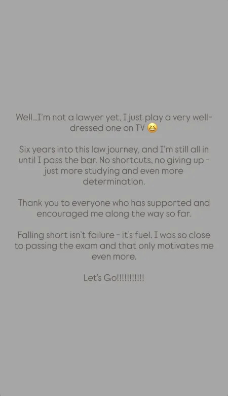 Em um story publicado em sua conta no Instagram, Kim Kardashian assumiu que ainda não alcançou a aprovação no Bar Exam, apesar de todo o tempo e esforço dedicados ao estudo. "Ainda não sou advogada, só interpreto uma bem-vestida na TV. Seis anos nessa jornada do Direito e continuo dedicada nela até passar o Bar Exam", escreveu a empresária, que tem se dedicado à sua formação jurídica paralelamente à sua carreira de influenciadora e empresária.