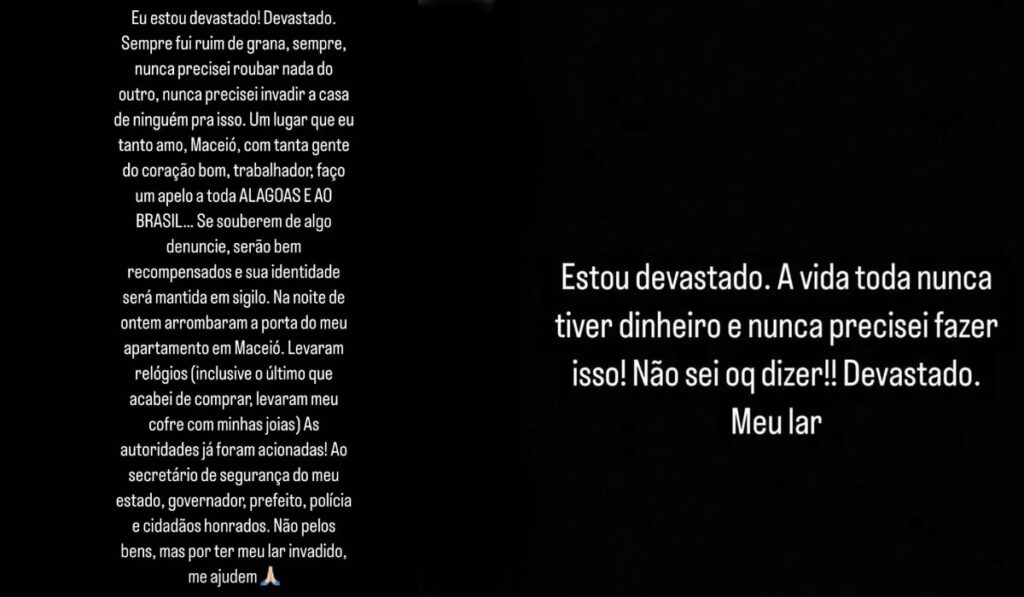 "Na noite de ontem arrombaram a porta do meu apartamento em Maceió. Levaram relógios (inclusive o último que acabei de comprar), levaram meu cofre com minhas joias. As autoridades já foram acionadas. Um lugar que eu tanto amo, Maceió, com tanta gente do coração bom, trabalhador, faço um apelo a toda Alagoas e ao Brasil: se souberem de algo denuncie, serão bem recompensados e sua identidade será mantida em sigilo", declarou.