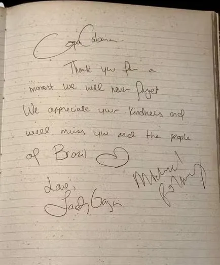 Lady Gaga deixou mensagem carinhosa aos fãs brasileiros no Livro de Ouro do Copacabana Palace