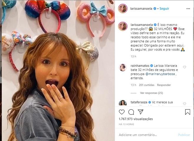 "É isso mesmo produção?? 32 MILHÕES. Esse vídeo define bem a minha reação. Eu recebo todo esse carinho e ele me preenche de uma forma muito especial! Obrigada por estarem aqui. Eu seguirei, por vocês e pra vocês", declarou na legenda da postagem.