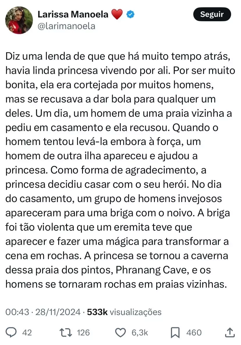 Larissa Manoela, acompanhada do marido André Luiz Frambach, chamou atenção nas redes sociais durante sua viagem à Tailândia ao compartilhar fotos de uma visita a um altar cultural conhecido como “Caverna da Princesa”, na província de Krabi. O local, que abriga esculturas de pênis de madeira em diferentes formatos, é um ponto turístico popular e está associado a uma lenda local.