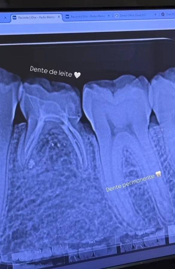 "Eu tenho uma coisa muito específica que a gente conseguiu ver na radiografia, gente, que é um dente de leite. Até hoje. Enquanto o siso nasce agora, com 24 anos, eu sigo com 24 anos tendo um dente de leite. E ele é tão bonitinho, dá para ver, assim, obviamente, muito diferente do meu dente permanente, mas ele é uma fofura, uma fofura. Está lá, lindinho; não tem um outro dente, por isso que ele não caiu, e a gente segue cuidando justamente para manter uma boca saudável", contou ela.