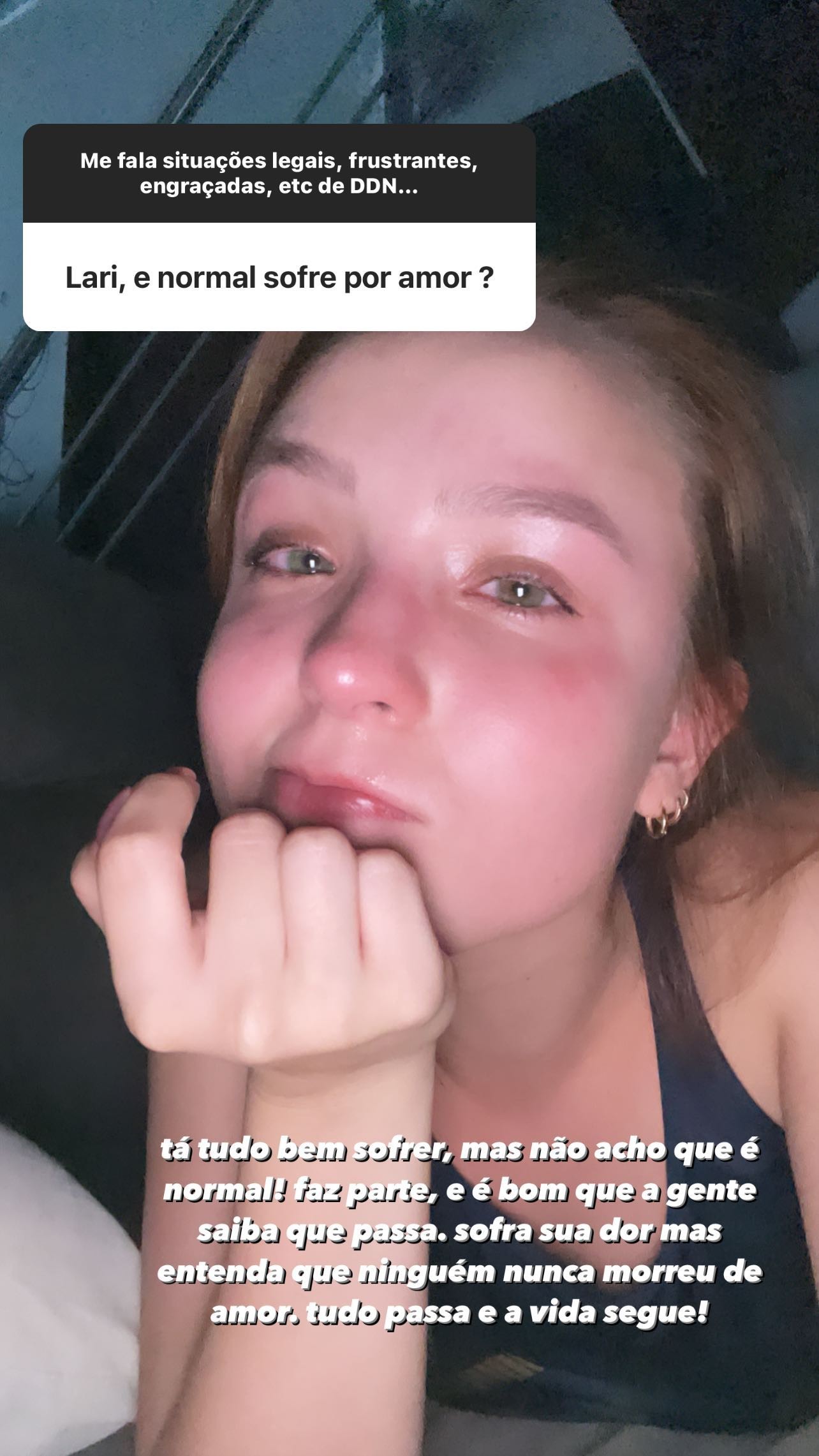 Em um dos cliques, ela respondeu uma pessoa que questionou se "era normal sofrer por amor" e Lari postou uma foto em que aparece chorando.