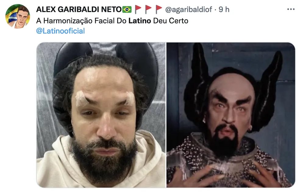 A transformação do visual de Latino deu o que falar nas redes sociais. Logo que o cantor apareceu totalmente diferente depois de tentar obter um rejuvenescimento facial, os internautas passaram a criar uma série de memes com suas fotos na web. A brincadeira que viralizou foi uma comparação do cantor com o personagem do diabo do filme O Auto da Compadecida, de 2000 - o papel em questão foi originalmente interpretado por Luís Melo. As informações são da Revista Quem/Globo.