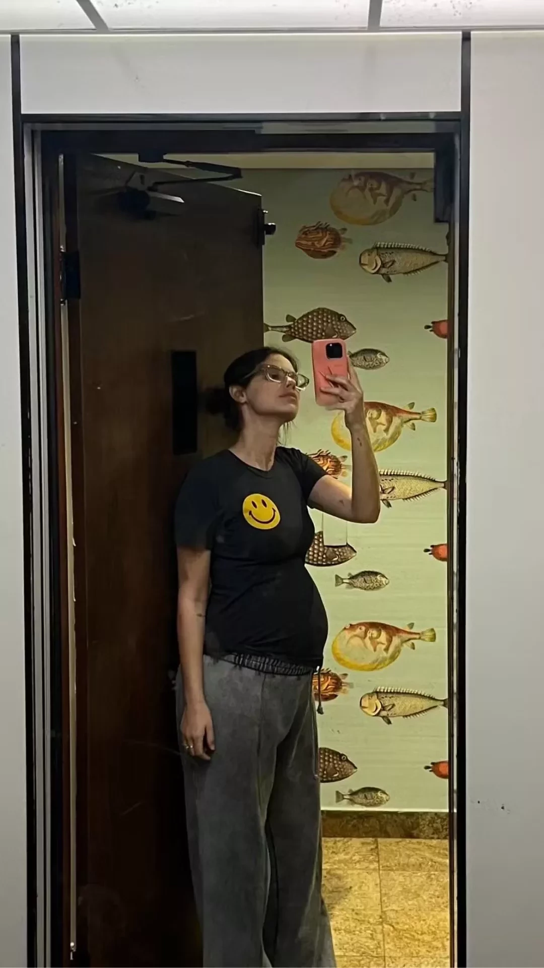 A imagem da atriz foi uma selfie simples em frente ao espelho, onde ela aparece vestindo uma camiseta justa, evidenciando que a barriga já está perceptível.