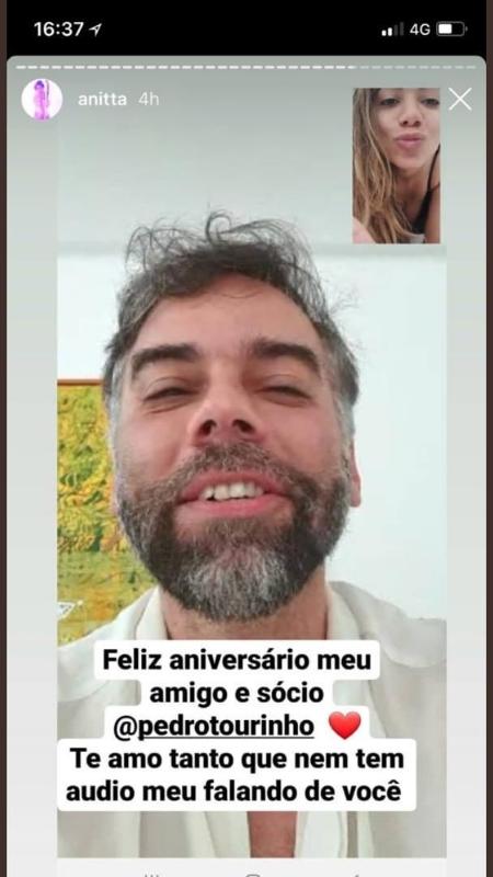 Nesta semana, quando Tourinho fez aniversário, Anitta fez uma postagem no Instagram para reforçar a amizade entre os dois. "Feliz aniversário, meu amigo e sócio Pedro Tourinho. Te amo tanto que nem tem áudio meu falando de você", escreveu ela na imagem em que os dois aparecem fazendo uma chamada de vídeo.