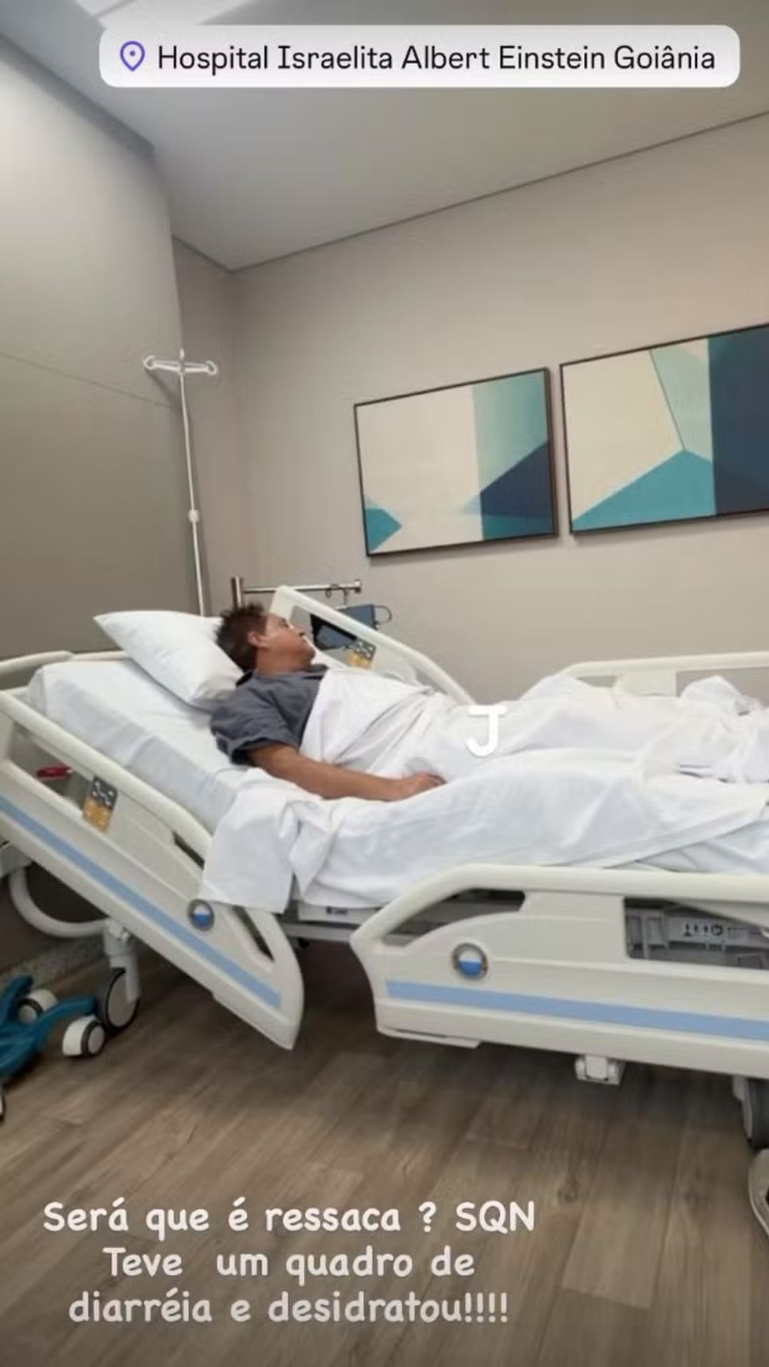 Poliana Rocha revelou aos seguidores nesta segunda-feira (8), no Hospital Israelita Albert Einstein Goiânia, que o cantor Leonardo foi hospitalizado pela manhã após apresentar um quadro de desidratação decorrente de diarreia. A esposa do artista explicou que ele recebeu soro na veia para se recuperar e detalhou o motivo da ida ao centro médico ao mostrar o momento nas redes sociais.