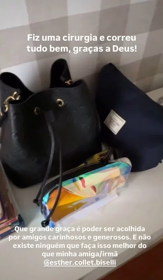 "Fiz uma cirurgia e correu tudo bem, graças a Deus! Que grande graça é poder ser acolhida por amigos carinhosos e generosos. E não existe ninguém que faça isso melhor do que minha amiga/irmã Esther Collet Biselli", escreveu em um story que mostra um pouco mais da recepção.