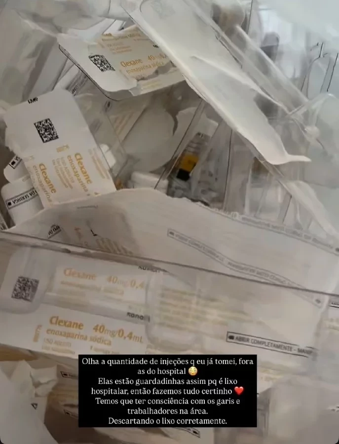 "Olha a quantidade de injeções que eu já tomei, fora as do hospital. Elas estão guardadinhas assim porque é lixo hospitalar, então fazemos tudo certinho. Temos que ter consciência com os garis e trabalhadores na área. Descartando o lixo corretamente", alertou.