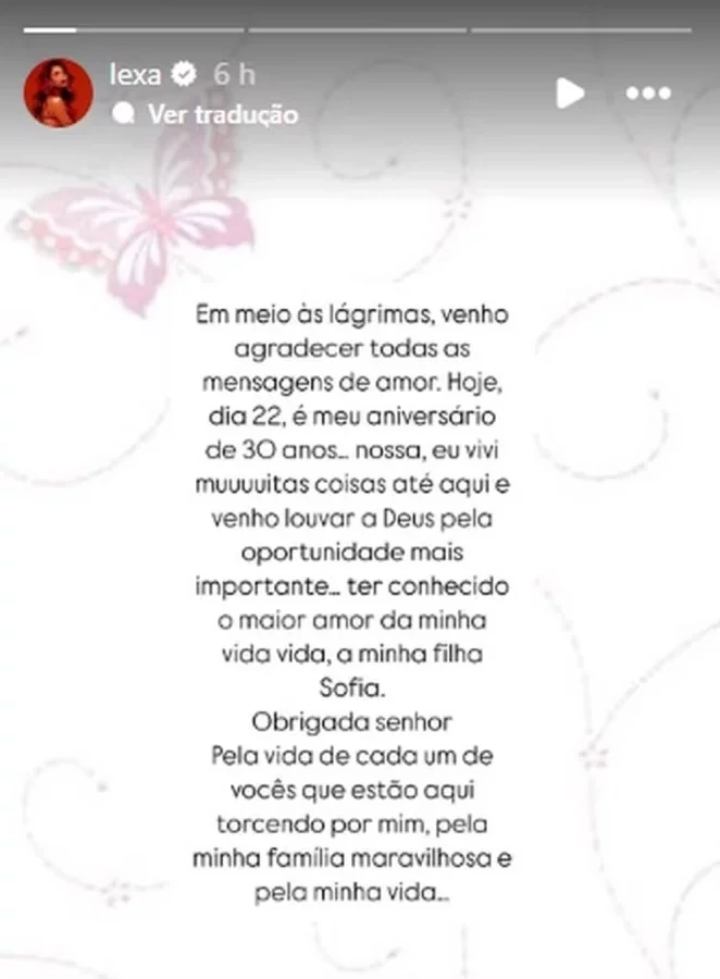 "Em meio às lágrimas, venho agradecer todas as mensagens de amor. Hoje, dia 22, é meu aniversário de 30 anos... nossa, eu vivi muitas coisas até aqui e venho louvar a Deus pela oportunidade mais importante... ter conhecido o maior amor da minha vida, a minha filha Sofia. Obrigada, Senhor, pela vida de cada um de vocês que estão aqui torcendo por mim, pela minha família maravilhosa e pela minha vida...", postou Lexa.