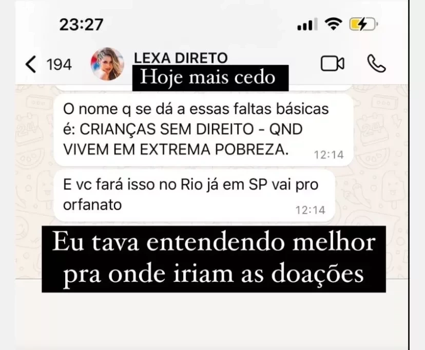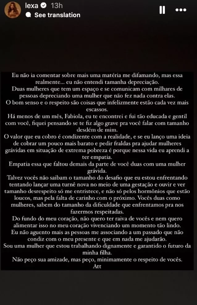 A cantora lamentou a falta de empatia e pediu respeito. “Estou trabalhando dignamente e garantindo o futuro da minha filha. Não peço sua amizade, mas peço, minimamente, o respeito de vocês”, declarou. Para reforçar sua iniciativa, Lexa ainda compartilhou um print de uma conversa sobre como as doações de fraldas seriam direcionadas às mulheres necessitadas.