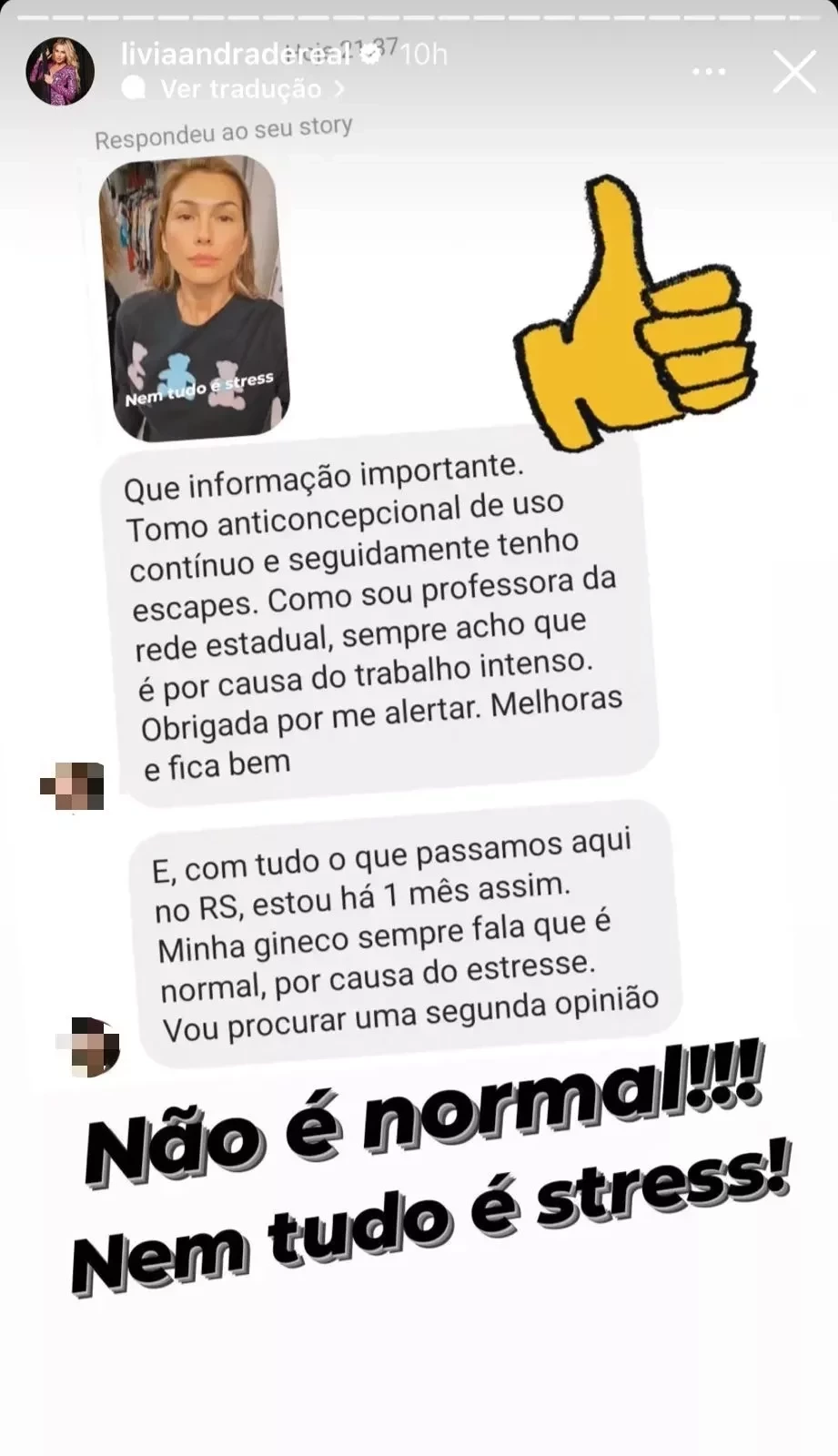 "Que informação importante. Tomo anticoncepcional de uso contínuo e frequentemente tenho escapes. Sempre achei que era devido ao trabalho intenso," relatou a seguidora, que decidiu buscar ajuda após ver o relato de Lívia: "Minha ginecologista sempre diz que é normal, por causa do estresse. Vou procurar uma segunda opinião," contou.