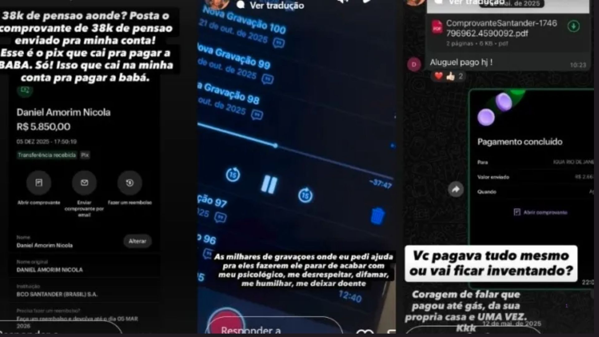 Na questão financeira, Lorena rebateu a planilha de gastos no valor de R$ 80 mil apresentada por MC Daniel. Ela afirmou que os valores incluem despesas da casa alugada para a família do cantor, além de custos pessoais dele em São Paulo, o que, segundo ela, não corresponderia à realidade apresentada.