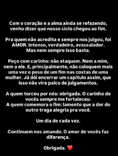 Com o coração e a alma ainda se refazendo, venho dizer que nosso ciclo chegou ao fim. Pra quem não acredita e sempre nos julgou, foi AMOR. Intenso, verdadeiro, avassalador. Mas nem sempre isso basta. Peço com carinho: não ataquem. Nem a mim, nem a ele. E, principalmente, não coloquem mais uma vez o peso de um fim nas costas de uma mulher. Já dói encerrar um capitulo assim, que isso não vire palco de julgamentos. A quem torceu por nós: obrigada. O carinho de vocês sempre me fortaleceu. A quem comemora o fim: lamento que a dor do outro traga alegria pra você. Um dia de cada vez. Continuem nos amando. O amor de vocês faz diferença. Obrigada, disse Lorena em seu Instagram.