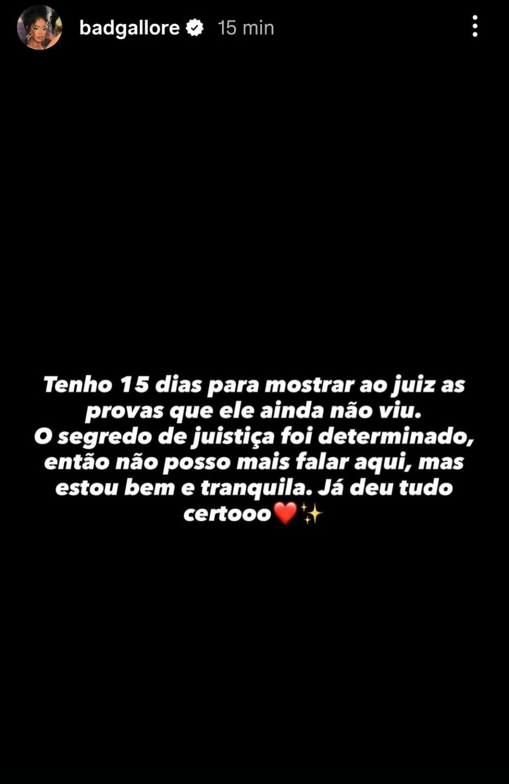 Segundo Lorena, ela tem prazo para apresentar novas provas ao Judiciário. “Tenho 15 dias para mostrar ao juiz as provas que ele ainda não viu. O segredo de Justiça foi determinado, então, não posso mais falar aqui”, afirmou a influenciadora em publicação no Instagram.