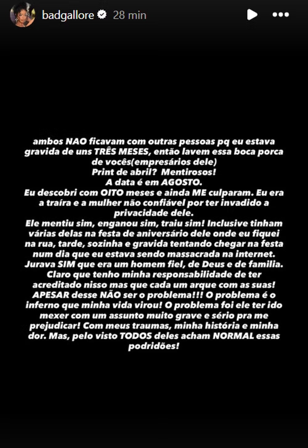 Segundo a influenciadora, a descoberta ocorreu quando ela já estava no oitavo mês de gestação. “Eu descobri com OITO meses e ainda ME culparam. Eu era a traíra e a mulher não confiável por ter invadido a privacidade dele”, relatou, afirmando que o episódio aconteceu enquanto ainda esperava o filho do então casal.
