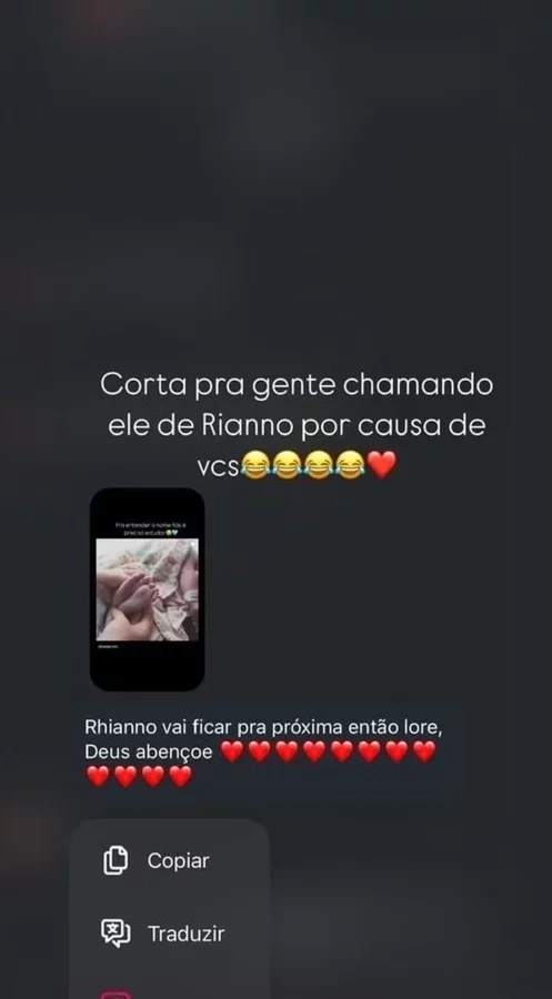 A empresária também brincou com seus seguidores e contou que apelidou o menino de Rianno, em alusão ao nome da cantora Rihanna, musa de Lorena. "Rihano vai ficar para a próxima, Deus abençoe", escreveu um seguidor. A mãe de Rás confessou: "Corta para a gente chamando ele de Rianno por causa de vocês".