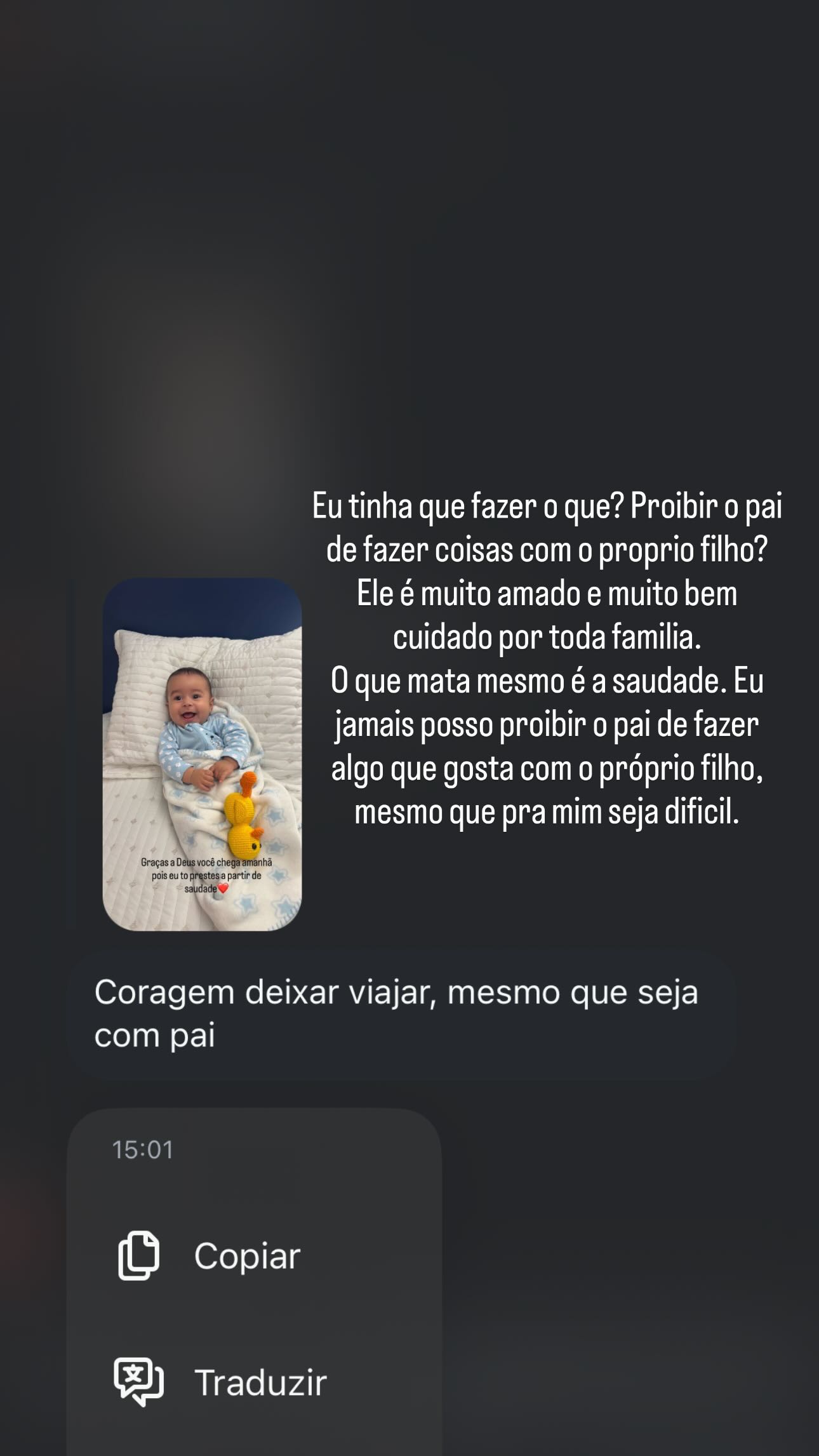 “Coragem deixar viajar, mesmo que seja com o pai”, escreveu o internauta. “Eu tinha que fazer o quê? Proibir o pai de fazer coisas com o próprio filho? Ele é muito amado e muito bem cuidado por toda a família. O que mata mesmo é a saudade. Eu jamais posso proibir o pai de fazer algo que gosta com o próprio filho, mesmo que pra mim seja difícil”, respondeu Lorena.