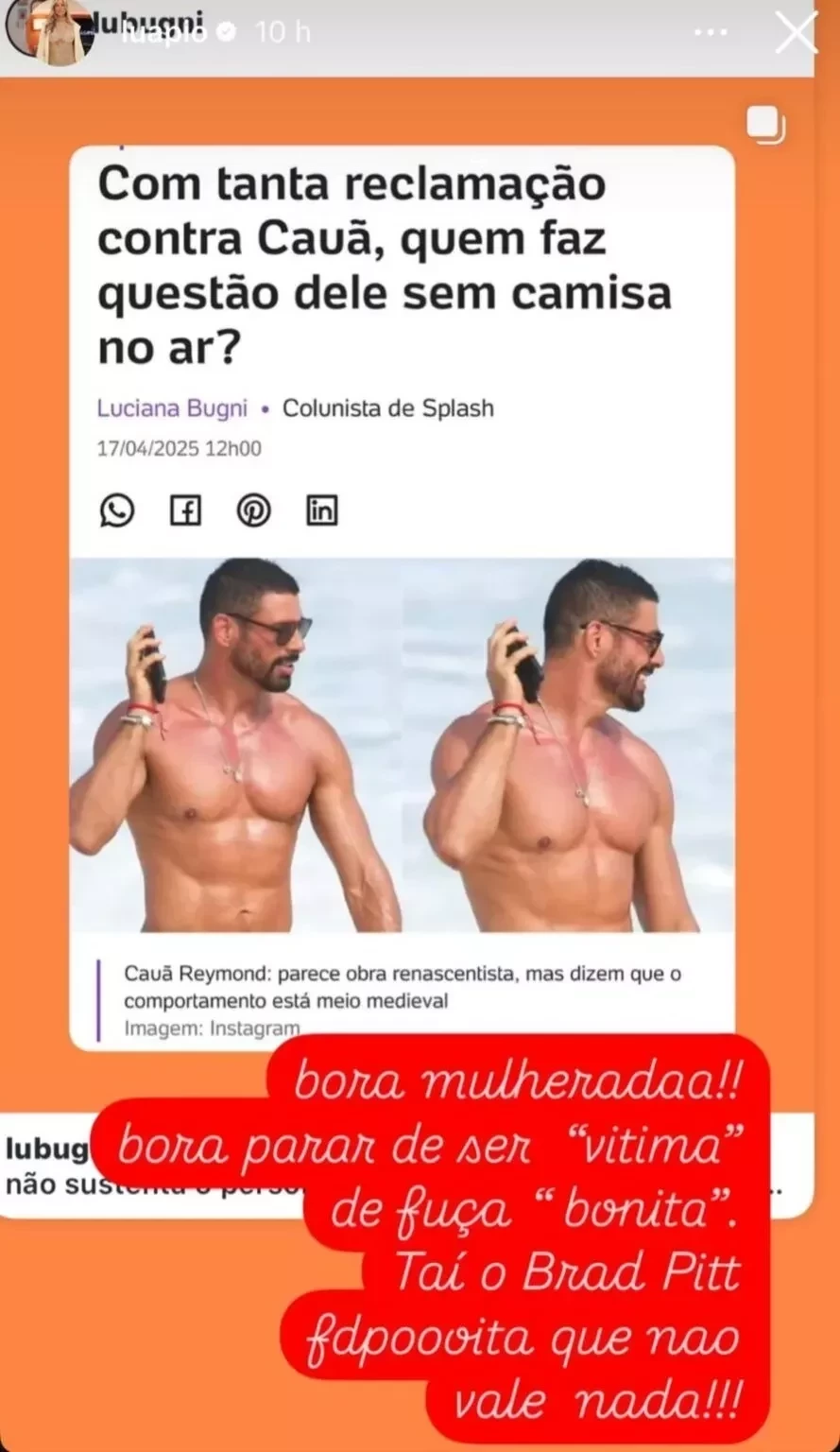 A atriz Luana Piovani utilizou suas redes sociais nesta sexta-feira (18) para se posicionar em meio à polêmica envolvendo o ator Cauã Reymond. Em seu perfil no Instagram, ela compartilhou uma publicação da colunista Luciana Bugni, que questionava o espaço dado ao ator nas telinhas: “Com tanta reclamação contra Cauã, quem faz questão dele sem camisa no ar?”.