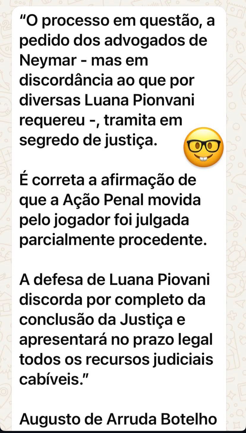 A atriz Luana Piovani foi condenada pela Justiça de São Paulo por injúria contra o jogador Neymar Jr., em ação relacionada a publicações feitas nas redes sociais em 2024. A decisão foi assinada pelo juiz Rodrigo César Müller Valente, da 2ª Vara Criminal da Barra Funda, e divulgada nesta quinta-feira (16/10) pelo portal LeoDias. A sentença foi proferida na quarta-feira (15/10).