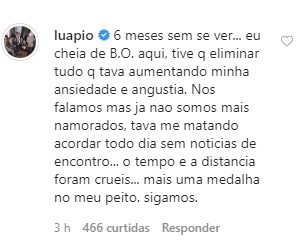 "Seis meses sem se ver... Eu cheia de B.O. aqui, tive que eliminar tudo que estava aumentando a minha ansiedade e angustia. Nos falamos, mas já não somos mais namorados. Estava me matando acordar todos dias sem notícias de encontro. O tempo e a distância foram cruéis... Mais uma medalha no meu peito. Sigamos", anunciou ela no Instagram neste domingo, 12.