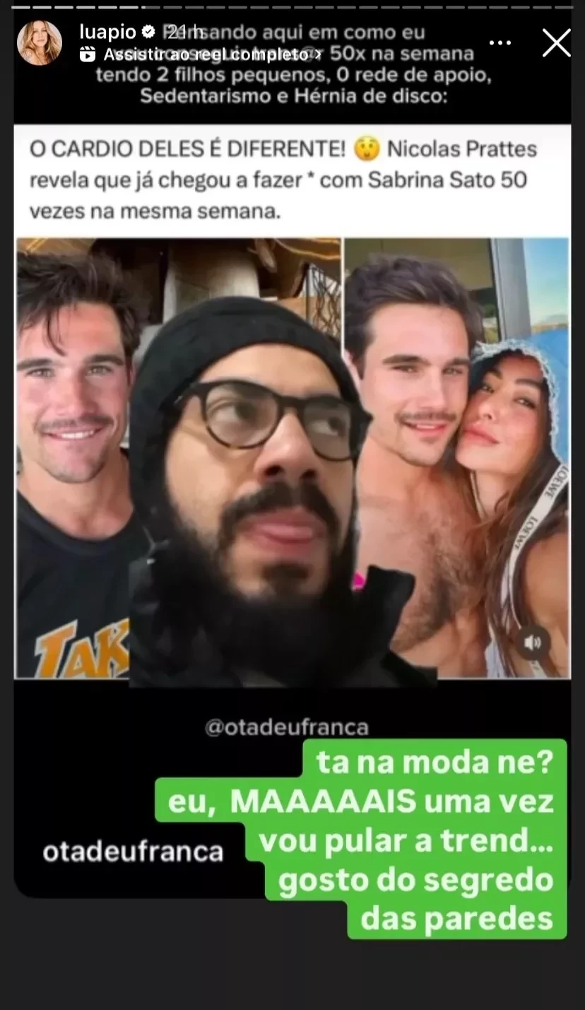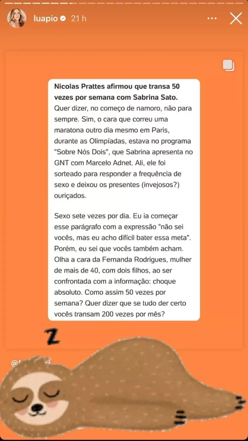 Na tarde desta quarta-feira (14), a atriz Luana Piovani utilizou suas redes sociais para comentar uma recente declaração do ator Nicolas Prattes sobre sua vida íntima. Durante uma participação no programa "Sobre Nós Dois", apresentado por Sabrina Sato e Marcelo Adnet, Nicolas afirmou que ele e Sabrina mantêm relações sexuais cerca de 50 vezes por semana. A declaração causou grande repercussão nas redes sociais.