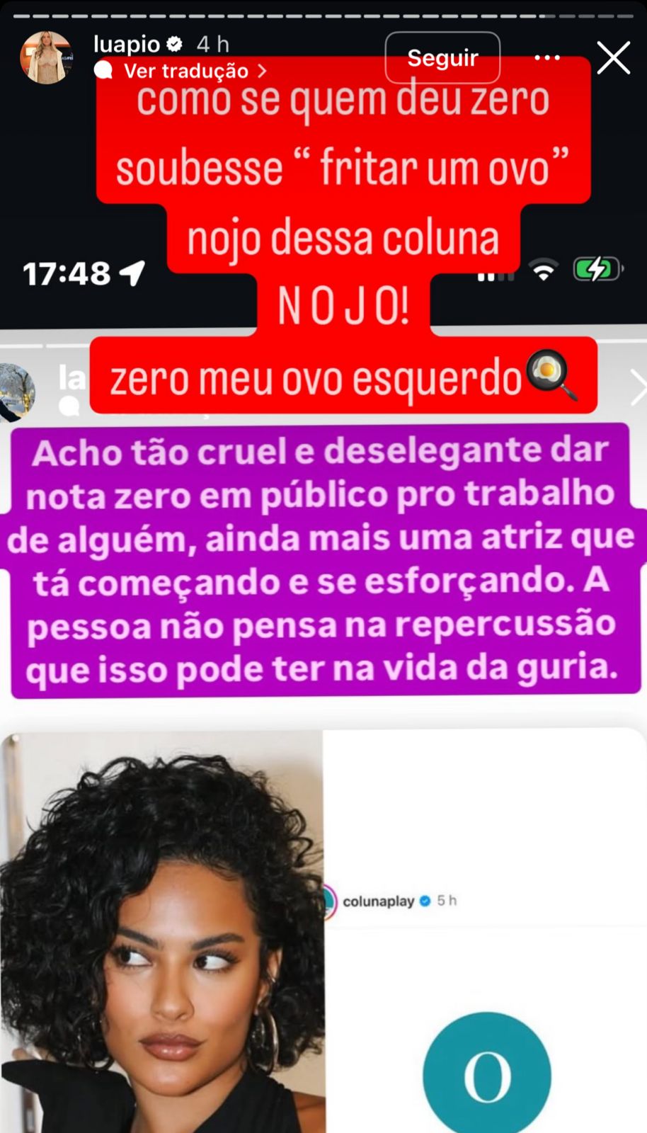 "Como se quem deu zero soubesse ‘fritar um ovo’. Nojo dessa coluna. Não! Zero meu ovo esquerdo”. Ela ainda compartilhou um recado escrito por outra pessoa, que dizia: “Acho tão cruel e deselegante dar nota zero em público pro trabalho de alguém, ainda mais uma atriz que está começando e se esforçando. A pessoa não pensa na repercussão que isso pode ter na vida da guria”, disparou.