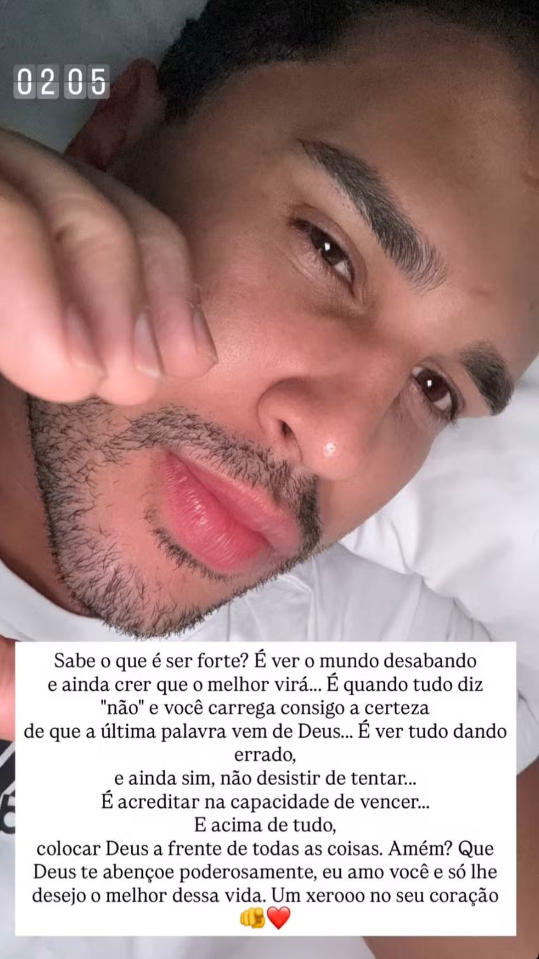 “Você sabe o que é ter força? É observar tudo desmoronando e, mesmo assim, manter a esperança de que dias melhores virão... É ouvir apenas ‘não’ e, ainda assim, acreditar que a decisão final vem de Deus... É insistir, mesmo quando nada parece funcionar... É confiar que pode superar... E, principalmente, entregar tudo nas mãos de Deus... Eu amo você e só quero o melhor dessa vida pra você. Um xerooo no seu coração”, escreveu.
