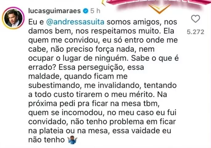 “Eu e Andressa Suita somos amigos, nos damos bem, nos respeitamos muito. Ela quem me convidou. Eu só entro onde me cabe, não preciso forçar nada nem ocupar o lugar de ninguém”, afirmou.