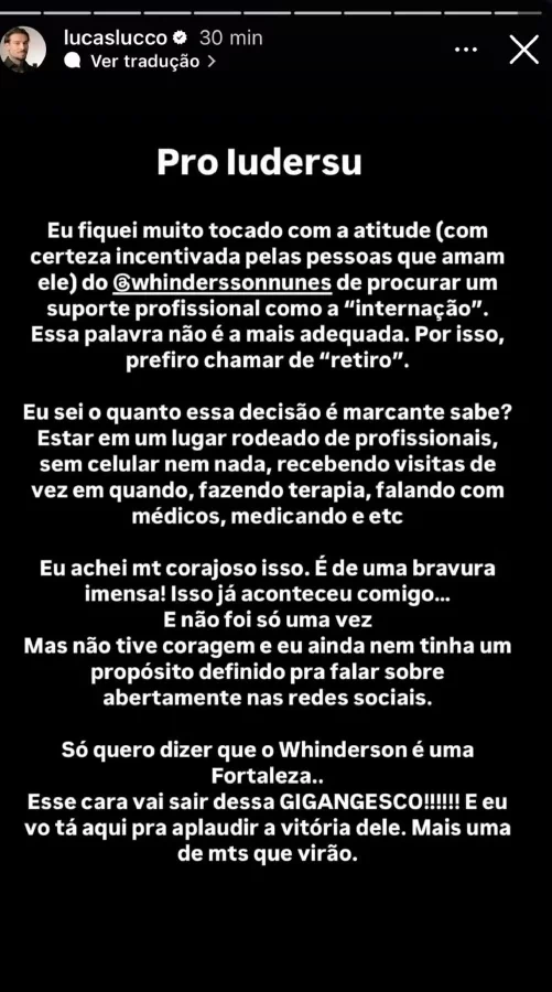 "Eu fiquei muito tocado com a atitude (com certeza incentivada pelas pessoas que o amam) do @whinderssonnunes de procurar um suporte profissional como a 'internação'. Essa palavra não é a mais adequada. Por isso, prefiro chamar de 'retiro'. Eu sei o quanto essa decisão é marcante, sabe? Estar em um lugar rodeado de profissionais, sem celular nem nada, recebendo visitas de vez em quando, fazendo terapia, falando com médicos, medicando etc.", começou ele.