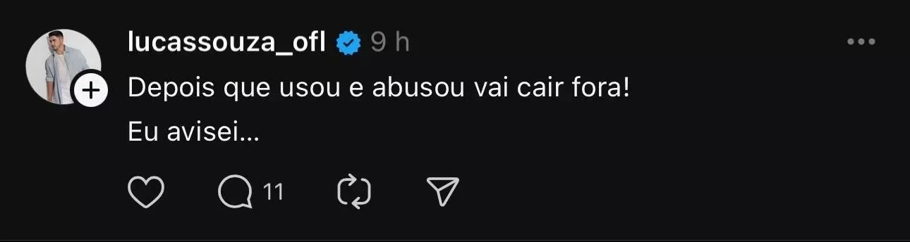 Após Jojo Todynho anunciar que irá remover a música "Arrasou, Viado" de todas as plataformas de streaming. O ex da cantora, Lucas Souza, publicou em seu perfil no Threads o que parece ser uma indireta a decisão da infuenciadora: "Depois que usou e abusou vai cair fora! Eu avisei", afirmou ele.