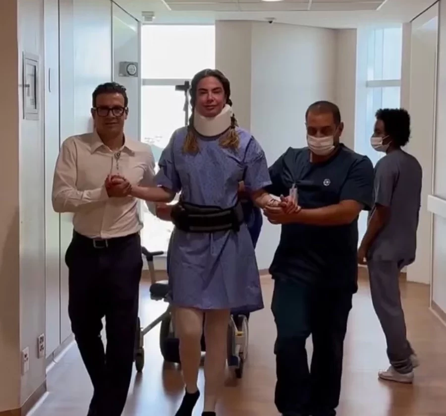 Nas imagens publicadas na rede social, a empresária aparece sentada em uma poltrona, enquanto um enfermeiro a auxilia nos exercícios de mobilidade. Em seguida, ela aparece usando um colar cervical e máscara. "Na real, só queria estar no after", brincou.