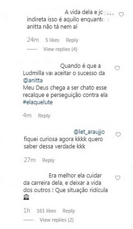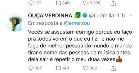 A treta entre Ludmilla e Anitta ganhou mais um capítulo nesta sexta-feira. Após deixar de ser seguida pela Poderosa no Instagram, a intérprete de "É hoje" alfinetou a ex-amiga no Twitter enquanto estava divulgando sua nova música, 'Verdinha". Um internauta questionou Lud sobre ela ter tirado a parte de Anitta da música "Onda diferente" em seu show, e ela alfinetada a cantora: