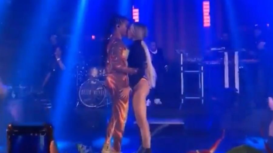 No palco, a dupla protagonizou um beijaço e levou o publico ao delírio.